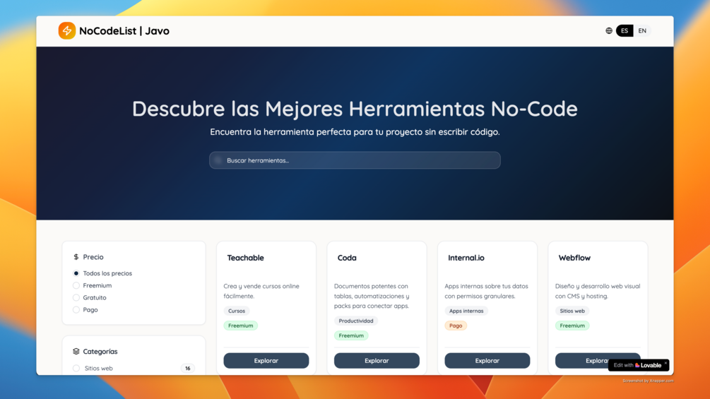- Directorio curado y actualizado con más de 100 herramientas NoCode.
